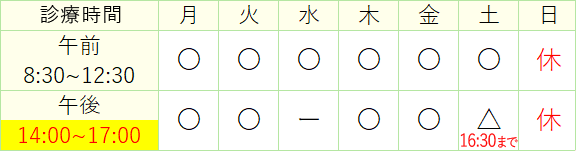 ※土曜日は 17:00 までの診療時間が 16:30 までとなります